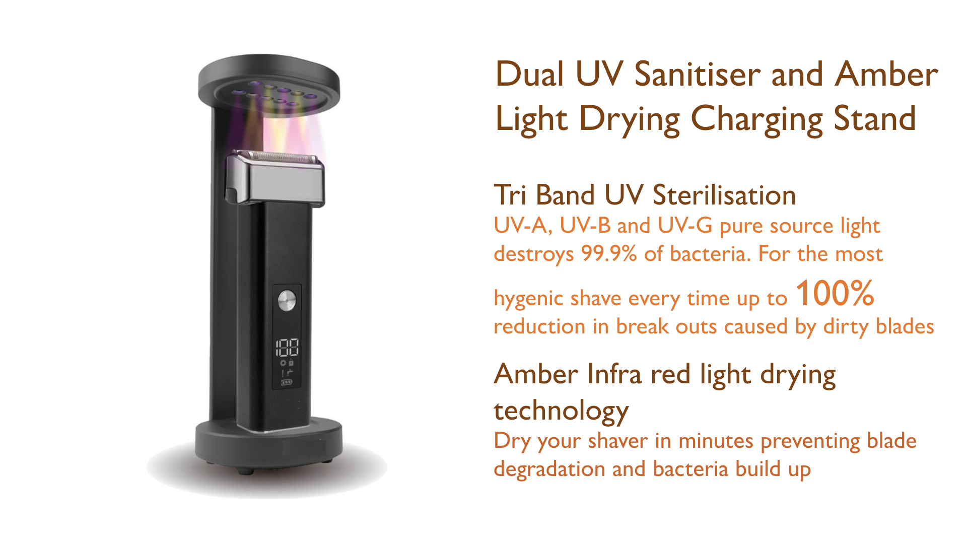 Combining UVA, UVB and UVGI to sterilise your Proshave+ to prevent bacteria that causes irritation with Amber light to dry your shaver in minutes, keeping the blades sharp for the cleanest and closest shave every time. Maintain your Proshave+ every day and charge it at the same time.
