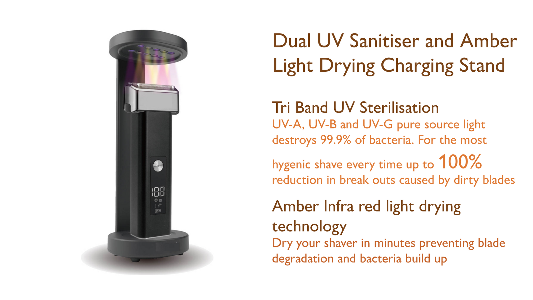 PRO SHAVE+ with Dual Drying and UV Sanitising Charging Stand, the ultimate shaving experience. Engineered by Oxford University Scientists for the most advanced shave, our Japanese stainless steel twin reciprocating blades provide the smoothest shave, while our restore band with vitamin A.C.E of shaves anti-ageing hydrating strip keeps your skin youthful. Get the closest shave for the sharpest look. Dual band UV sterilisation prevents skin irritation and break outs. Amber light dries in minutes to ensure blade remains sharp for best shave while charging. Elevate your shaving with PRO SHAVE+